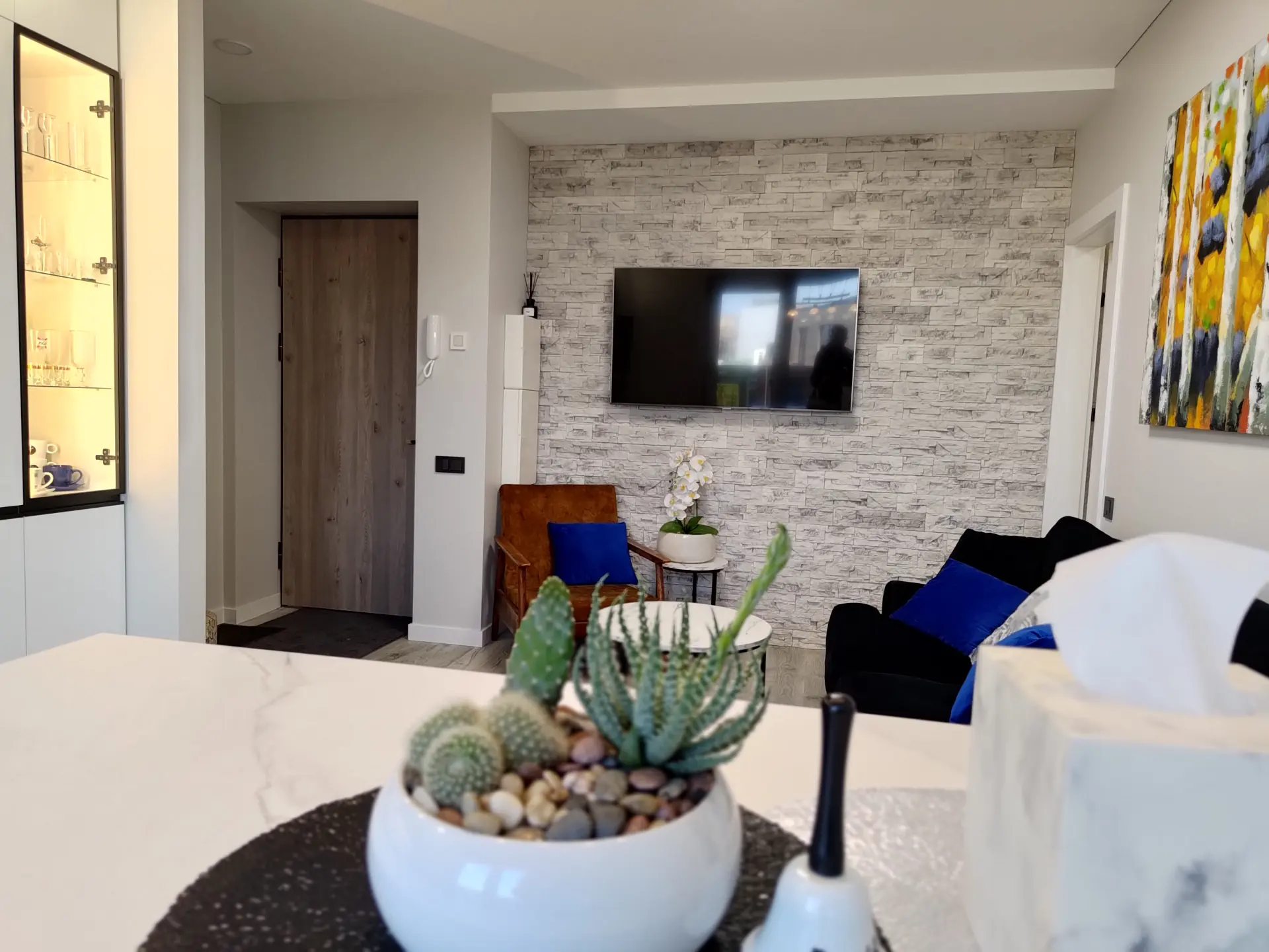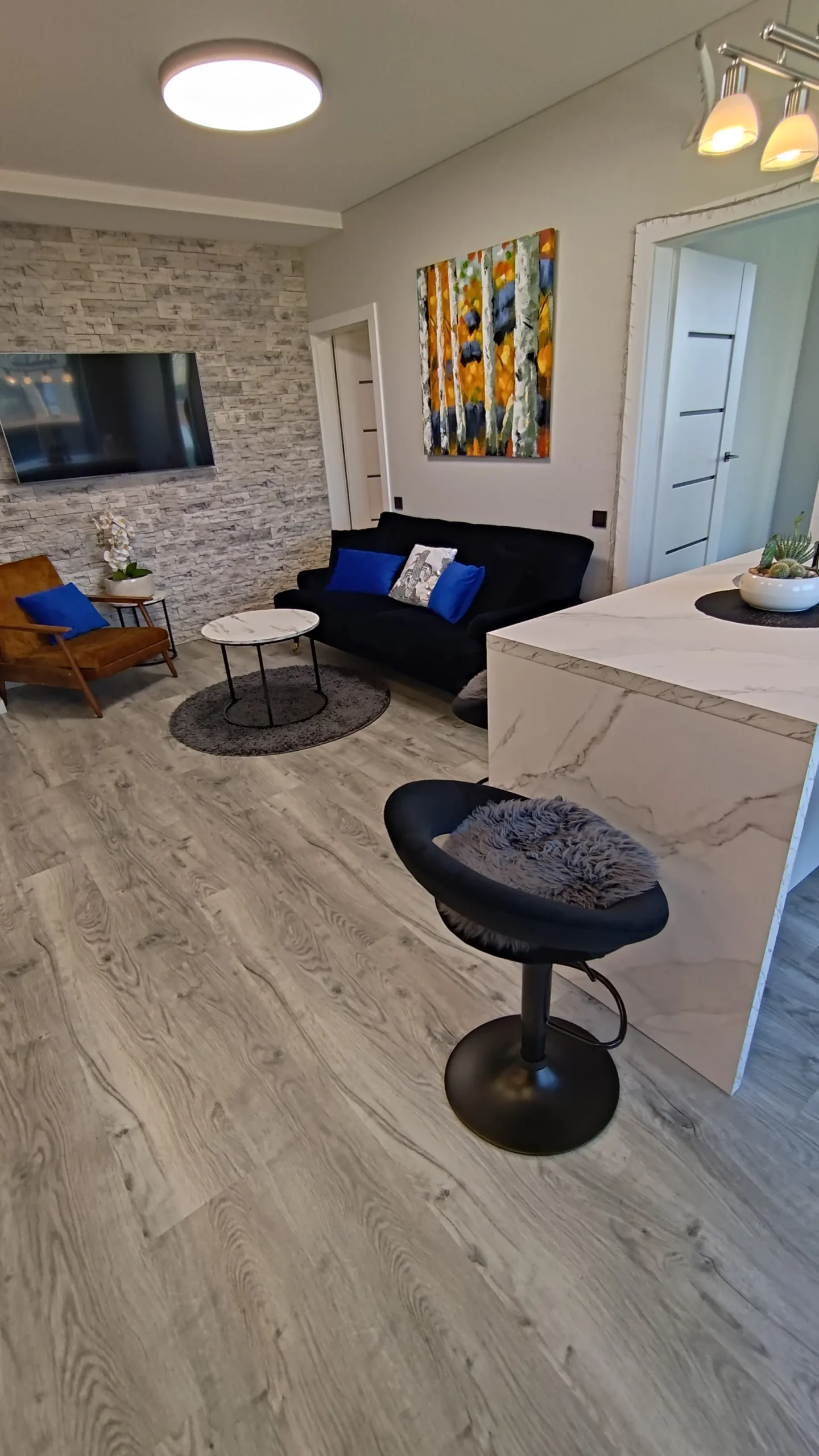 Svetainėje įrengta dekoratyvinė akmenų imitacijos siena – tai akcentas, ant kurio pakabintas televizorius. Tokios sienos montavimas reikalauja tikslaus pagrindo paruošimo ir kruopštaus klijų darbo, kad akmenys gulėtų tolygiai ir siūlės būtų vienodos.