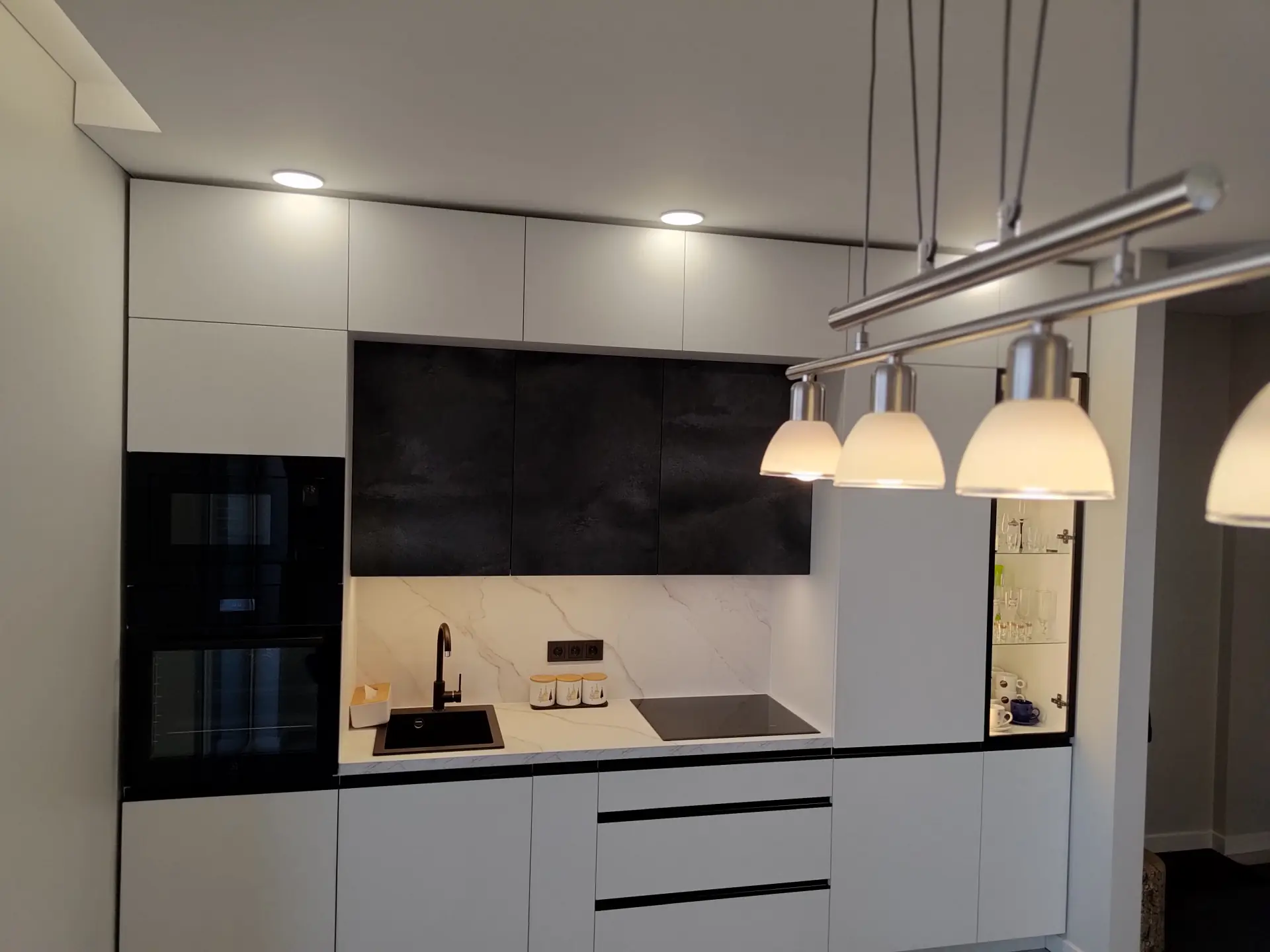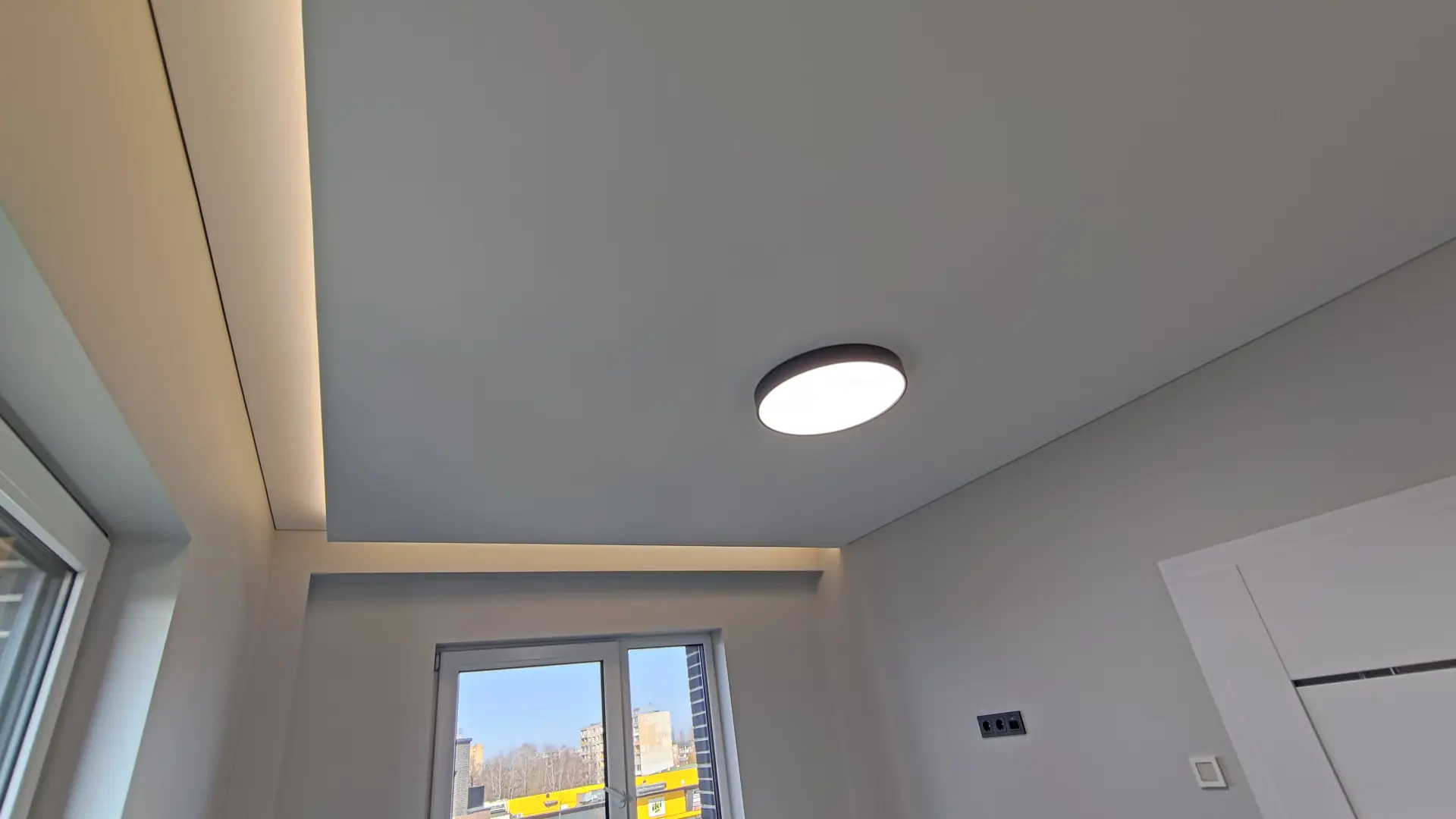 Lubose įrengtos daugiapakopės gipso kartono konstrukcijos su paslėptu apšvietimu. Tai vienas iš darbų, kur klaidos iškart pastebimos – briaunos turi būti lygios, kampai tikslūs, o visa konstrukcija tvirta. Elektros instaliacijos išvedimas apšvietimui atliktas pagal suderintą planą – įleidžiami šviestuvai virtuvėje, paslėptas apšvietimas lubų nišose, taškinis apšvietimas vonios kambaryje.