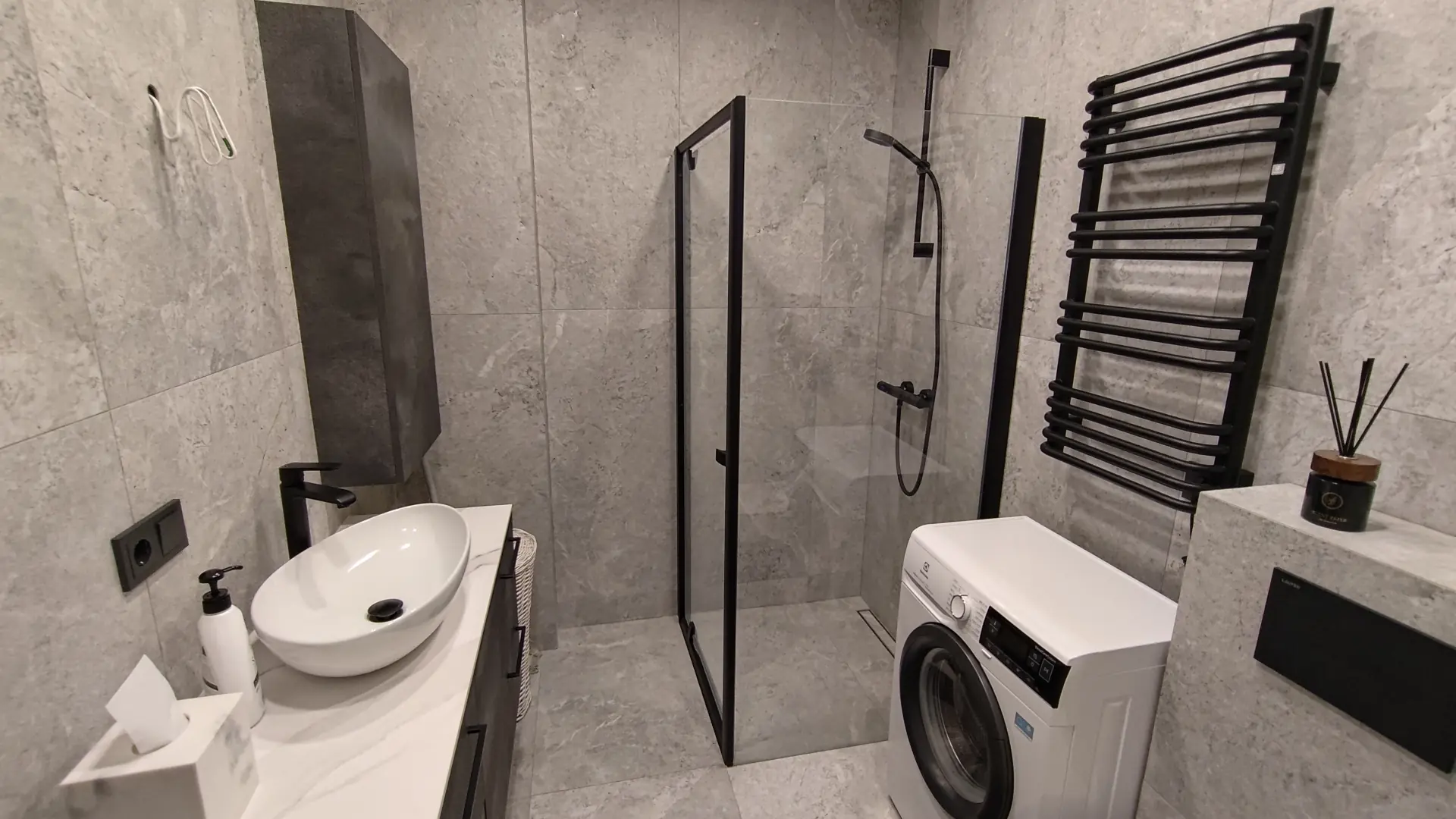Vonios kambaryje atliktas pilnas plytelių klijavimas – didelio formato pilkos marmuro imitacijos plytelės nuo grindų iki lubų ant visų sienų ir grindų. Didelio formato plytelės reikalauja labai lygaus pagrindo – bet koks nelygumas matomas iš karto. Pagrindas kruopščiai paruoštas, plytelės suklijuotos tiksliai, siūlės vienodos ir tiesios.